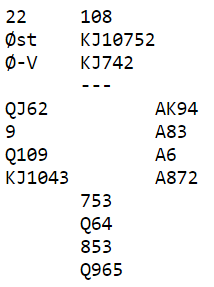 I Sarpsborg BK torsdag kveld var dette spillet nokså interessant, men merkelig nok klarte bare 4 par av 11 å melde slem. Nord giver og Ø_V im faresonen.