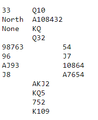 Det var noen par som gamblet litt her og havnet i 3NT hvor det er de samme elleve sikre stikkene som i hjerterkontrakt. Tre av dem som spilte grand fikk tak i tolv stikk og delte toppen (+46) for +490. De grandhaiene som fikk +460 fikk +6 av 48 oppnåelige. Mellom 460 og 490 kom de som hadde fått tolv stikk i hjerterkontrakt, og det ellevte stikket var gullkantet. Å få +480 ga +27, mens de som tapte til to ess, eller bommet kløveren etter at de hadde fått kastet unna ruteren ble avspist med -23, 50 poeng i sving pga. et lite overstikk.