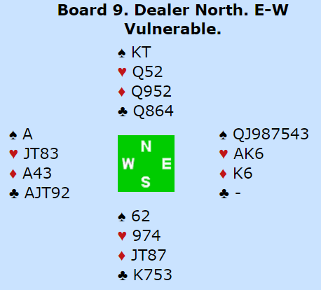 Åsmund spilte ut hjerter og spilleren stakk med 9-eren og konstaterte 6-1 sits i den fargen. Så kom ruter mot bordet og Åsmund la våkent i 10-eren!!! Det skapte en ny mulighet for spilleren. Er kortet ekte ser det ut som om damen kan fiskes opp gjennom Øst. Ergo stakk han med esset og lot ru J seile. Men da vant Stokkelan med ru D og kunne ta beten med sp A! Det ga Veteranlaget 13 imp på spillet da lagkameratene stoppet i fornuftige 3 NT med 11 stikk.