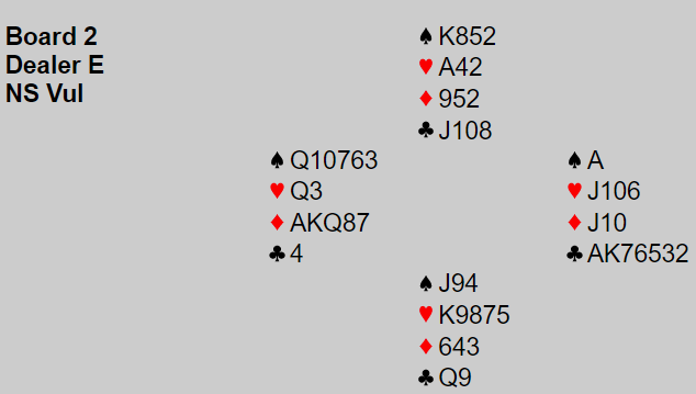 Det gikk tre ganger pass før Gorm Norstad i Øst åpnet med 1 kløver, 2+, og Syd gjentok sin pass før Arild Lysaker (V) svarte 1 ruter og Nord passet. Hva synes du øst nå bør melde, 16 hp er ganske mye og normalt har makker en del verdier siden motparten ikke blander seg inn i major på 1- trinnet. Men hva er mulige gjenmeldinger her? Med bare singel liten spar er grandbud nokså sjansebetonet, støtten im ruter er god og med den fargen som trumf er hånden verd 18 poeng inkludert fordeling for kortfarge. Da vilm kanskje hopp til 3 ruter som invitt være noe for beskjedent?
