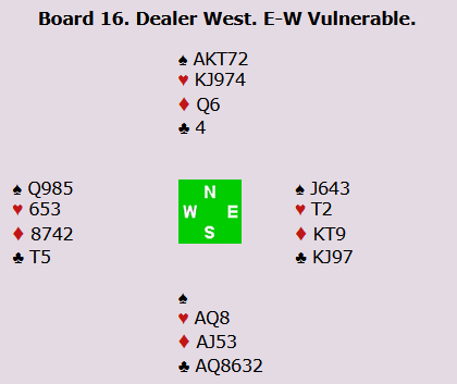 Christian stakk utspillet med esset. Deretter kløver til stjeling og hjerter til esset fulgt av nok ei kløverstjeling. Inne på hånda spilte Christian ruter dame, som ble dekket av kongen, og esset i bordet vant stikket. Nok ei kløverstjeling godspilte bordets farge. Christian tok for hjerter knekt, samt ess-konge i spar før en ruter til bordets knekt fulgte. Nå ble den siste uteværende trumfen trukket ut, før Christian kunne kreve resten av stikkene. Vunnet lilleslem ga 13 IMP til Norge i dagens aller siste spill da kroatene stoppet i utgang ved det andre bordet.