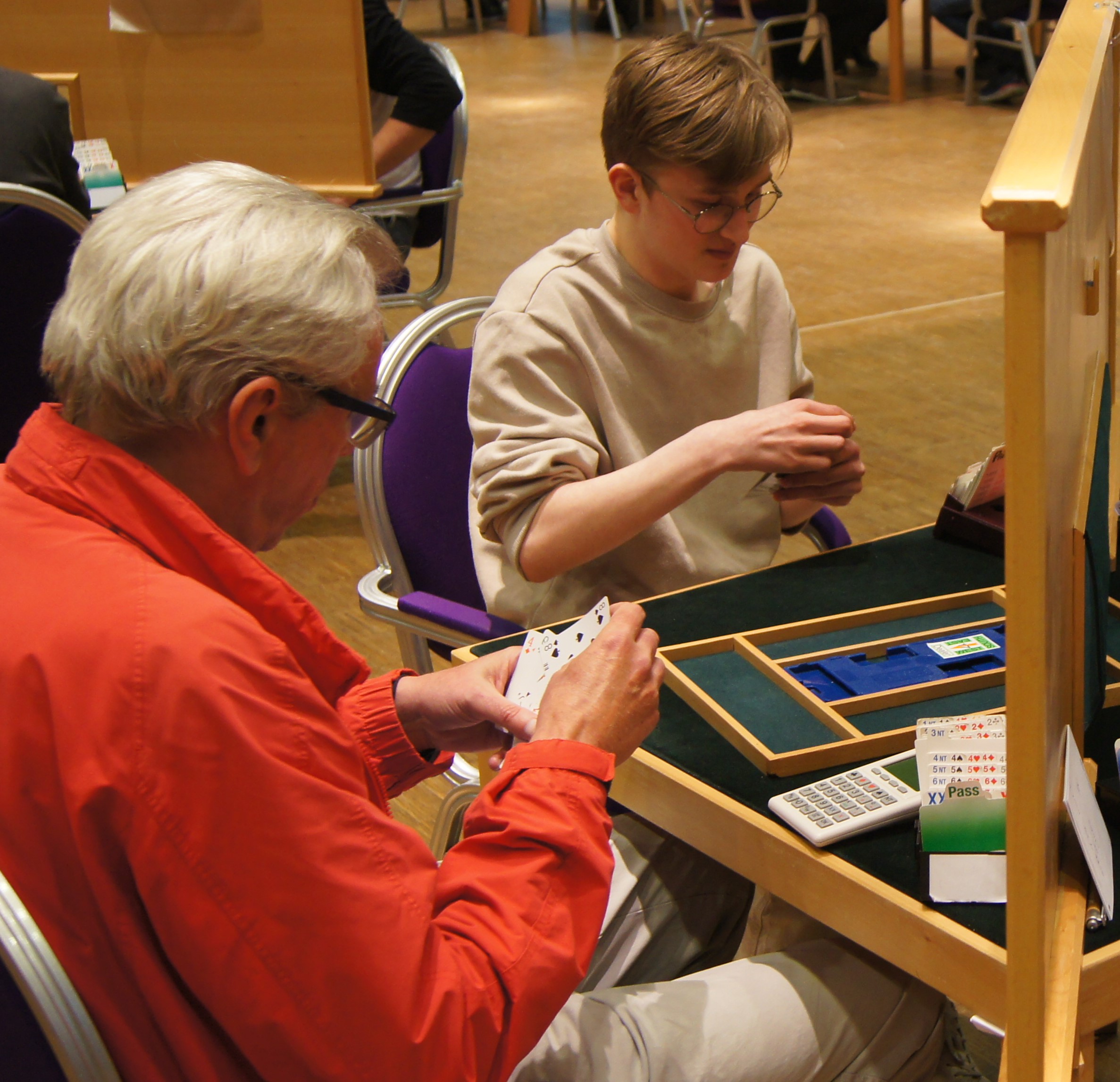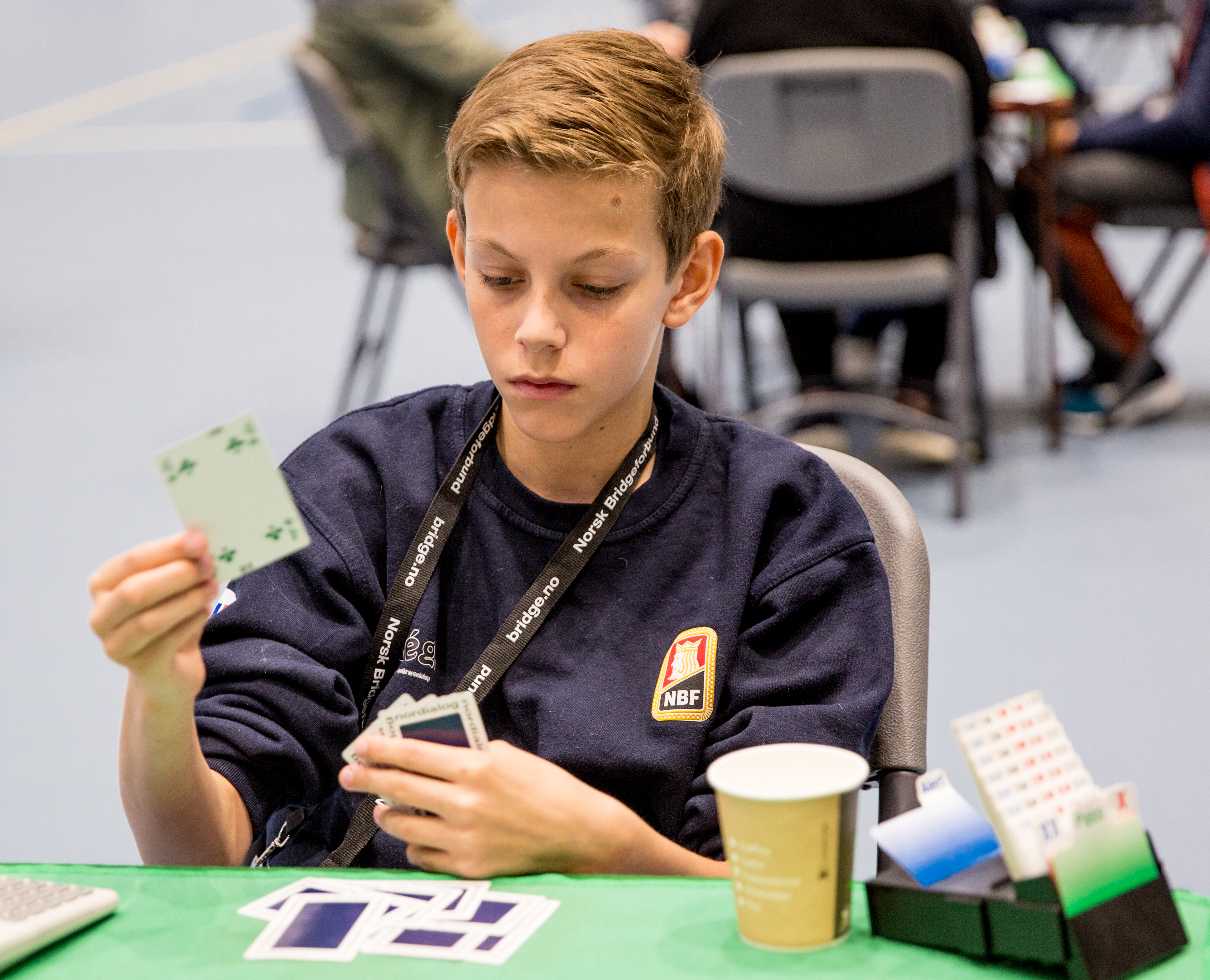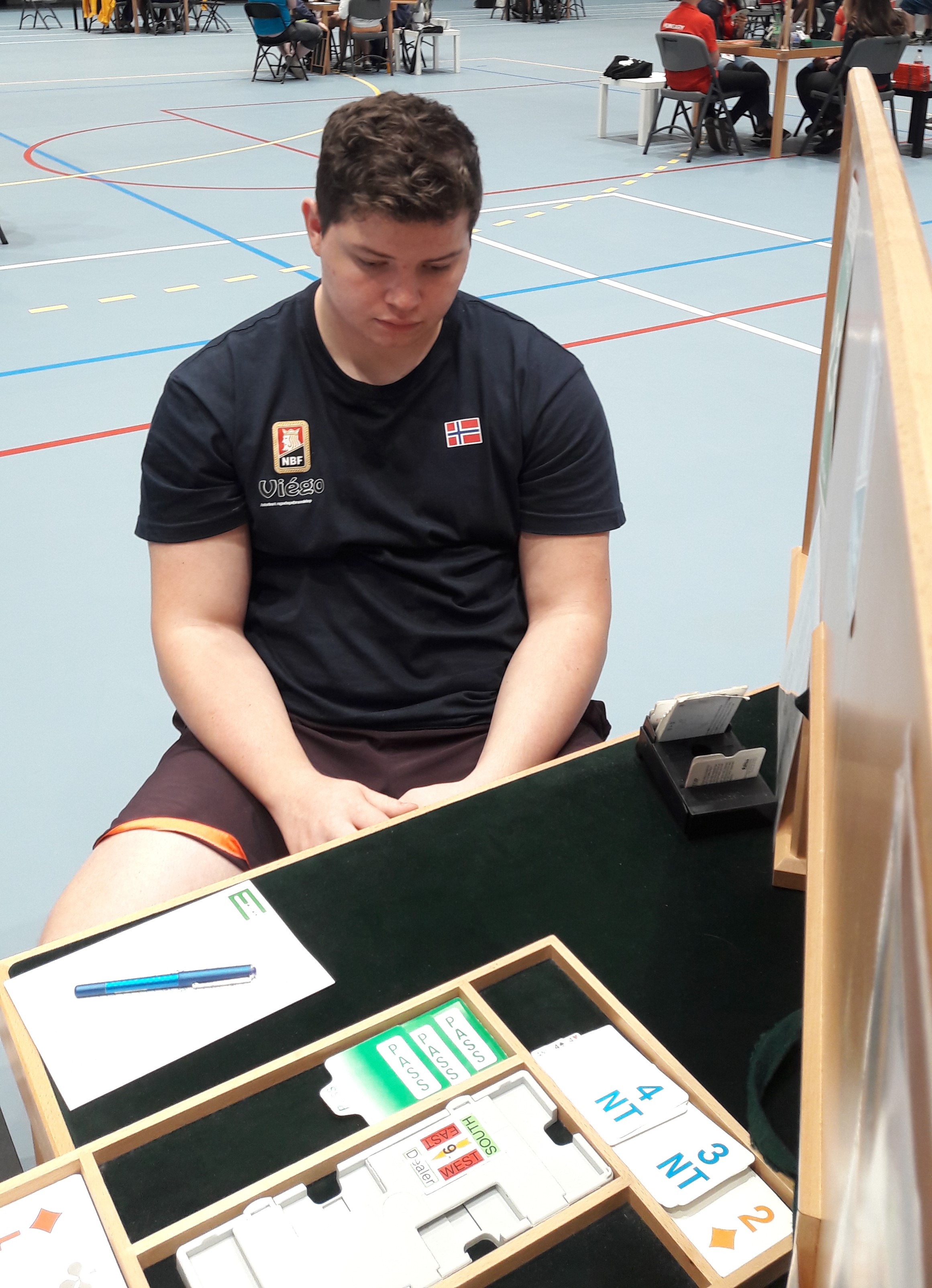 Marthinussen i Øst åpnet med 1 hjerter (5+) og jeg svarte 1 spar. Gjenmelding med hopp er minst utgangsinvitt og krav mot styrke 8-9 men Arne nøyde seg med gjenmelding 2 ruter Det var da med 7- kort bra farge naturlig å gjenmelde 2 spar. Arne gjenmeldte 3 hjerter, jeg 3 spar som Marthinussen løftet til 4 spar. Nord ga meg fordel ved å spille ut kl A og fortsette med kl D som gikk til min konge. Hvordan unngå 4 tapere? Jeg mangler jo trumf dame blant 5 spar de andre har samt taper i både ruter og kløver i tillegg. Det er 6 hjertere ute og sitter den fargen 3-3 imot kan jeg kanskje få sak nok i minor, men med 5 trumf ute med damen på topp kan jo majesteten sitte dobbel? Jeg valgte siste mulighet, spilte trumf til esset og ruter derfra som løp til demen i Nord. Kløver opp til Syd sin knekt ga -1 da Nord opprinnelig satt med sp D93 og damen måtte gi dem det 4. stikket. Men her var kortblindhet og dårlig valg ute og gå. Nord hadde sp D93- hj 1986- ru D1074- kl AD9 og hadde jeg etter 3. stikk der sp A vant spilt hjerter fra topp, på 3. honør saket ru J og så spilt hj 10. Da må Syd som bare har sp 5 igjen stjele, men da saker jeg bare kl 7- klassisk «taper på taper» og med tett trumf ellers ender det bare med en taper til uansett hvordan trumfen skulle sitte. Men vi tålte -2 siden kvelden ellers bød på mange plusspill.