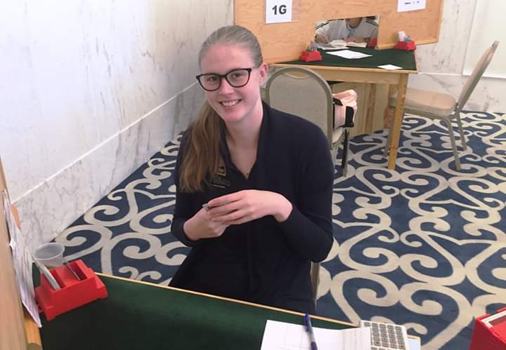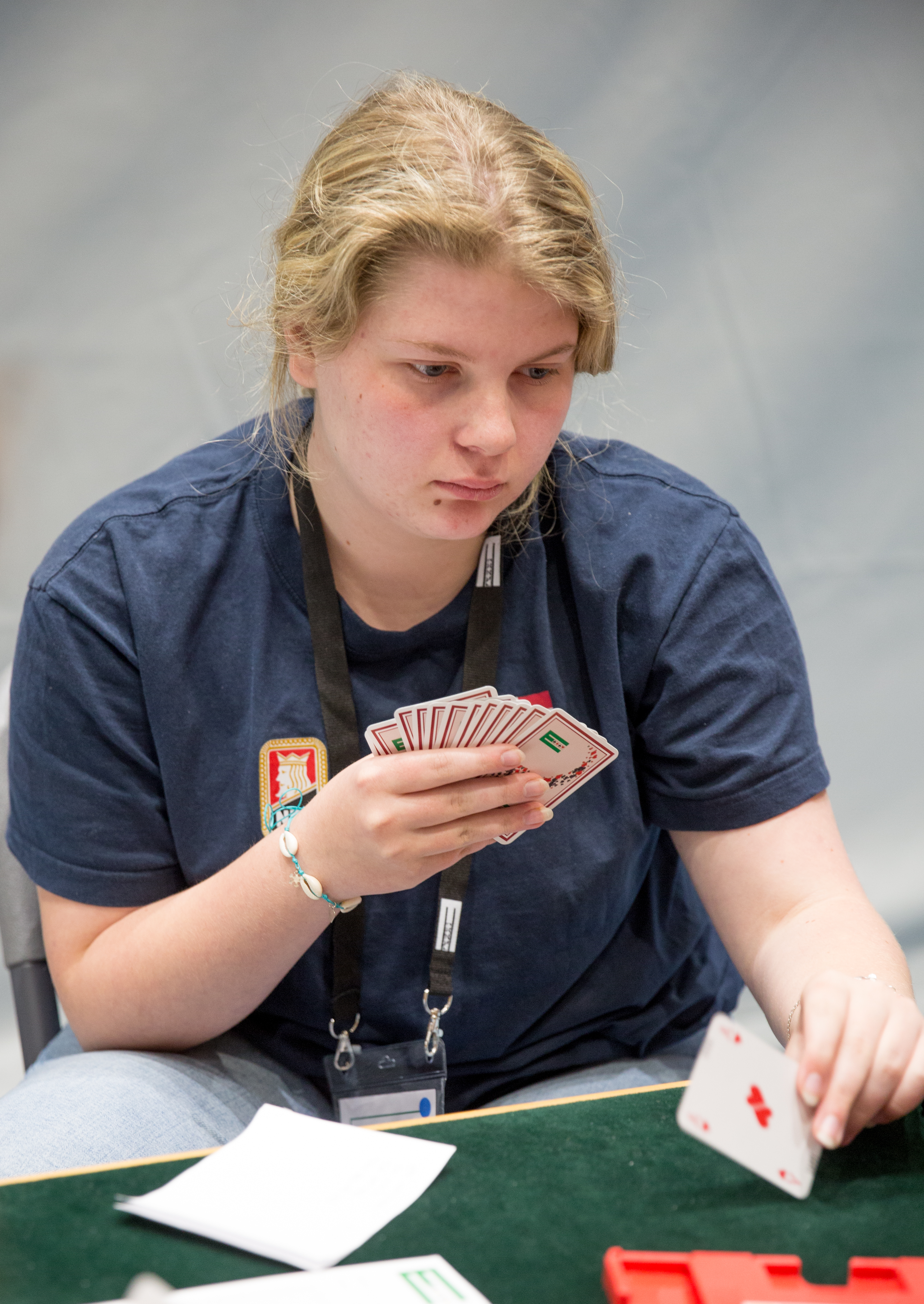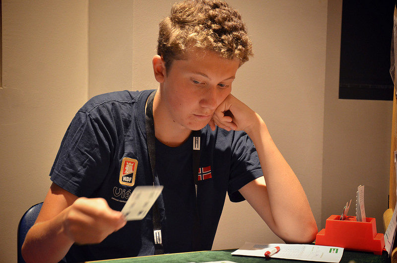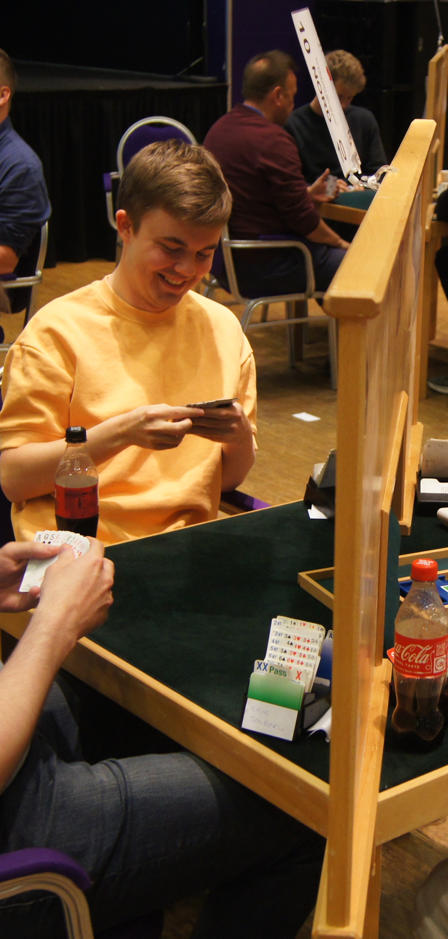 Marthinussen i Øst åpnet med 1 hjerter (5+) og jeg svarte 1 spar. Gjenmelding med hopp er minst utgangsinvitt og krav mot styrke 8-9 men Arne nøyde seg med gjenmelding 2 ruter Det var da med 7- kort bra farge naturlig å gjenmelde 2 spar. Arne gjenmeldte 3 hjerter, jeg 3 spar som Marthinussen løftet til 4 spar. Nord ga meg fordel ved å spille ut kl A og fortsette med kl D som gikk til min konge. Hvordan unngå 4 tapere? Jeg mangler jo trumf dame blant 5 spar de andre har samt taper i både ruter og kløver i tillegg. Det er 6 hjertere ute og sitter den fargen 3-3 imot kan jeg kanskje få sak nok i minor, men med 5 trumf ute med damen på topp kan jo majesteten sitte dobbel? Jeg valgte siste mulighet, spilte trumf til esset og ruter derfra som løp til demen i Nord. Kløver opp til Syd sin knekt ga -1 da Nord opprinnelig satt med sp D93 og damen måtte gi dem det 4. stikket. Men her var kortblindhet og dårlig valg ute og gå. Nord hadde sp D93- hj 1986- ru D1074- kl AD9 og hadde jeg etter 3. stikk der sp A vant spilt hjerter fra topp, på 3. honør saket ru J og så spilt hj 10. Da må Syd som bare har sp 5 igjen stjele, men da saker jeg bare kl 7- klassisk «taper på taper» og med tett trumf ellers ender det bare med en taper til uansett hvordan trumfen skulle sitte. Men vi tålte -2 siden kvelden ellers bød på mange plusspill.
