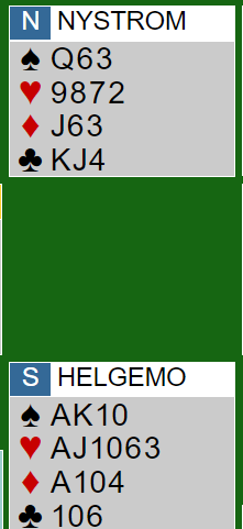 Vi har sett det uttalige ganger før når det gjelder Geir Helgemo, det kommer en spilleføring som ser så så såre enkel ut, og kontrakten er vunnet på sekunder. Jeg vet ikke helt hvordan han tenkte her, men prøver meg på litt gjetting.