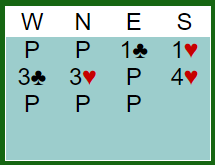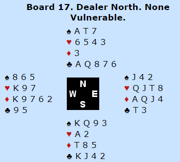 Dette utgangen burde vel være ganske enkelt å vinne på flere måter for mange, og ikke det aller mest spektakulære vi har sett fra den kanten, men det skjedde annerledes enn spillet gikk ved de fleste bordene. Og nesten halvparten av N/S-parene gikk bet, noen av dem bet i 3 hjerter (!), og enkelte gikk to bet i 4 hjerter (for eks. de bommet trumfen med esset først, og bommet også kløveren).