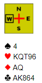 Ved det andre bordet startet det også med to passer før øst var i det litt kreative hjørnet og klinket til med en uvanlig sperremelding med disse kortene, 17 HP og flott fordeling. Det er etter min mening å strekke det litt langt med hensyn til det med «litt frihet mot en passet makker». Men det fungerte meget godt!