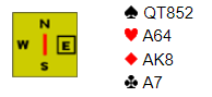 Du forstår vel dette lett?! Trolig brukte paret her elementer av Glen Grøtheim sitt systen Relepresisjon der åpningen viser 1+ og 11-15 hp og kan ha skjev fordeling. Makker viser styrke og åpner s0pør deretter etter beholdning i sin gjenmeldte farge. 4 kløver satte forslag til trumf, 4 hjerter trolig annet alternativ og 5 hjerter invitt til slem. Men der bremset de opp. Men det hjalp lite for Thor Erik Hoftaniska satt jo med 2 sikre stikk imot i trumf og med ru D ut til A, tre ganger hjerter fra topp kom Nord inn og spilte sp J som dro D, K og A. Nå kunne ikke eks- verdensmester Tundal unngå taper også i ruter eller spar så det endte med en bet. Butt spill altså!