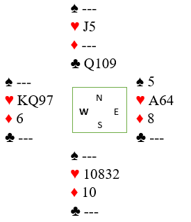 Arne Marthiussen (N)- Fred Hansen (S) kom slik i 3 NT. Pass rundt til Fred som med 21 hp åpnet med Multi 2 ruter (svake 2 i major eller jevn 20-21 grandhånd), Arne svarte 2 hjerter og Fred gjenmeldte 2 NT som viste 20-21. Da kunne Arne løfte til utgang . Hvordan spille, det ser jo enkelt ut bare ruter ess er i Vest. Da kan de andre ikke få mer enn 1 stikk i hjerter og ett i ruter hvis hj D blir stukket. Er hjerteren fordelt 4-4 imot vil 3 NT alltid stå, men er hjerteren 5-3 eller enda skjevere med lengden i Vest og ru A i Øst er 1. stikk kritisk. Da må det lasjeres i 1. og 2. stikk. Hva ville du valgt, stikke med hj A direkte og spille ru K- eller lasjere og bruke hj J på neste runde hjerter som da sikkert kommer. Øst kan jo ha hj KD.. men det er ikke trolig med liten ut fra Vest.