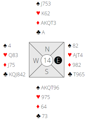 Det store flertallet var i utgang spilt av syd, nesten alle i 4 spar. Det var ganske standard med tretten stikk i 4 spar etter kløver konge i utspill.
