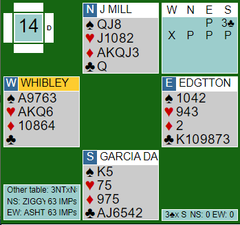 Syd var Rodrigo Garcia da Rosa, proffspiller fra Uruguay, og han hadde vel noe som lignet mer på en hånd egnet for åpningen 3 kløver enn østs kort. Men det ble ingen hyggelig kontrakt å spille. Han fikk tak i to sparstikk, ett ruterstikk, stikk for kløver ess og knekt samt en hjerterstjeling med liten trumf. Det ble seks stikk, tre doblede bet, ASHTON +500.