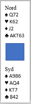 Det er på ingen måte nok stikk til å vinne denne utgangen om ikke kløverfargen blir godspilt. Det er dog et åpenbart problem, idet kløveren godspilles mot Ø/V få komme inn, og om det er øst som kommer inn er det lett å se at det går fryktelig galt om ruteren sitter slik som det ser ut, A-Q sjette (fra start) hos vest og to små hos øst. Øst spiller ruter gjennom syds konge, vest får fem ruterstikk og det blir to bet.