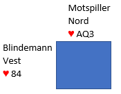 Helgemo var i 3NT. Øst hadde meldt inn 1 hjerter etter starten 1 kløver fra syd og svaret 1 ruter fra nord (Bakke). Ved det andre bordet gikk meldingene annerledes, og øst fikk ikke meldt inn på ett-trinnet. Likevel fant Charlsen (vest) beste utspill, liten hjerter. Det utspillet kom selvsagt også der øst hadde meldt hjerter.