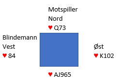 Øst har tilsynelatende tre sikre stikk etter denne starten, pluss de to stikkene forsvaret allerede har fått. Men siden øst har ruter dame gardert, spar ess og de to godspilte hjerterstikkene blir han satt under et enormt press idet kløverstikkene ble tatt. Øst kjente igjen denne posisjonen og gikk ned på singel ruter dame ganske tidlig (det var tatt en ruterhonnør så kun K-J-x-x var igjen hos blindemann).