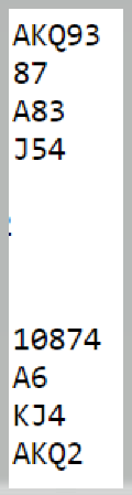 Atle fikk vist 15-17 grandhånd med 5 kort i spar, hj A  men ikke ru A! På 5- ess Blackwood 2 ess men ikke sp KD og da Flemming viste sterk  hånd var nok 7 kløver forslag til å preferere i sort farge. Sp K mangler jo men sitter den i Øst vil 4 kort spar der gi sikker taper i 7 spar men det ble unngått: