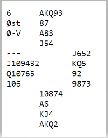 På hans hånd. Ergo la jeg bare ispJi 2. stikkog den holt. På sp Aog K fulgte Terje med sp D og 10 og trumfen var ute.Så liten hjerter, lavt fra Magnar og jeg prøvde med hj J fra blindemann som droesset. Ny ruterkunne jeg trumfe, spille hjeter til kongen og stjelenok en hjerter, men da viste det seg atØst bare hadde hatt singel ess i hjerter. Det gjensto å ta finesse i kløver som nok måtte gå feil trodde jeg, men da kl D vant neste stikk hadde jeg resten og vi fikk +4 for det. Haug hadde sp D105- hj A- ru AJ109872- kl J6.der jeg var giver og ingen i faresonen. Min hånd:
