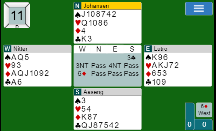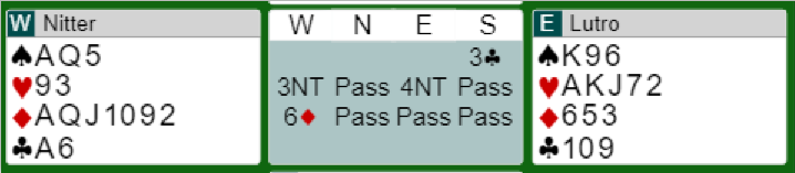 Her tok både Nitter og Lutro hardt i og meldte en bra lilleslem. Det var dog noen valg før det var slem til notering. Nord spilte ut spar 7. Nå lyser det sparstjeling mot spillefører hvis han slipper inn nord på trumfkongen som han godt kan ha. Derfor dengte Nitter ned trumfesset og spilte en stor trumf til. Litt overraskende var det syds som vant det stikket med ruter konge, han hadde dessuten tre trumf fra start.