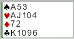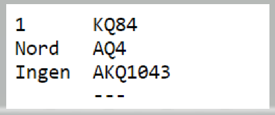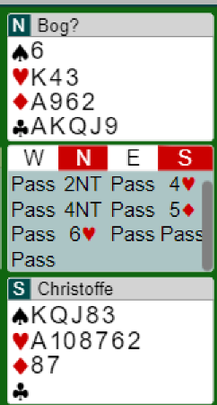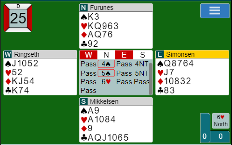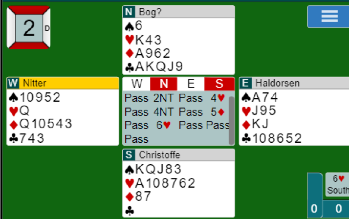 Ved det andre bordet var Rubbestadnesets N/S også i 6 hjerter og fikk ruter ut. Der ble det spilt hjerter til esset og hjerter til kongen for så å ta kløverstikk med avkast av ruter og spar fra syd. Men da ble det en bet siden hele spillet så slik ut: