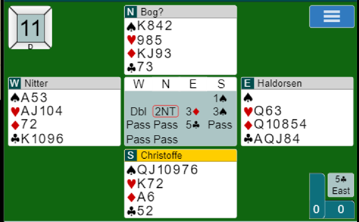 Ved det andre bordet åpnet også nord med 2 kløver. Øst for Konnerud gikk innpå med kun 2 hjerter. Da det kom tilbake til nord valgte han å si 3 ruter i stedet for å doble. Syd meldte 3 hjerter – krav - noe måtte han jo si. Da nord foreslo 3 spar løftet syd til utgangen 4 spar. Ved det bordet holdt Jarle Melby (vest) fingrene unna doblingskortet. Så spillefører var ikke varslet om at det sannsynligvis satt skjevt i trumffargen.