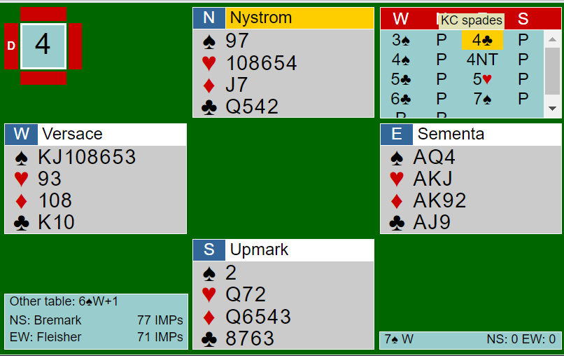 Øst doblet slemmen i håp om to kløverstikk, en Ligthnerdobling for å unngå hjerterutspill (doblingen ber om unaturlig utspill, og hjerter ut er det mest naturlig slik meldingene har gått). Men Ø/V har kun ett kløverstikk, så slemmen står uansett. Vest visste ikke om det skulle kløver eller ruter ut og valgte ruter knekt. Da ble det tretten stikk, (nesten) claim i stikk en. Det var bare å ta ut trumfen, stjele god ruteren, stjele en hjerter og ta for den femte ruteren med kløveravast. Så kryss-stjeling. Dette festspillet ga det norske paret +1310 som normalt er en topp. Det ga dog "bare" 95 % da ett par til hadde samme score, og det var også et par som noterte +1770 for 7 spar doblet med hjemgang!