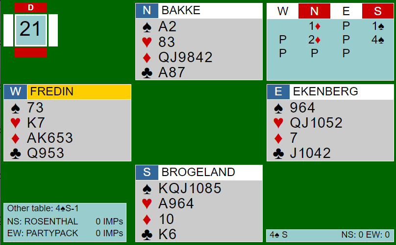 Med litt forsiktig pass i stedet for å melde 3 ruter fra Vest fikk da Kjennbakken vist sin langfarge og da det deretter gikk pass rundt var det etterpå enkelt for Nord å snelle inn 9 stikk som ga dem topp med 110 inn. Ø-V kunne fightet i ruter og den kontrakten ville gitt 10 stikk! Thor påpeker at han selv høyst kan ha dobbelton i spar, for med 3- kort kan han doble for å vise det hvis Torfinn over 2 ruter hadde passet.