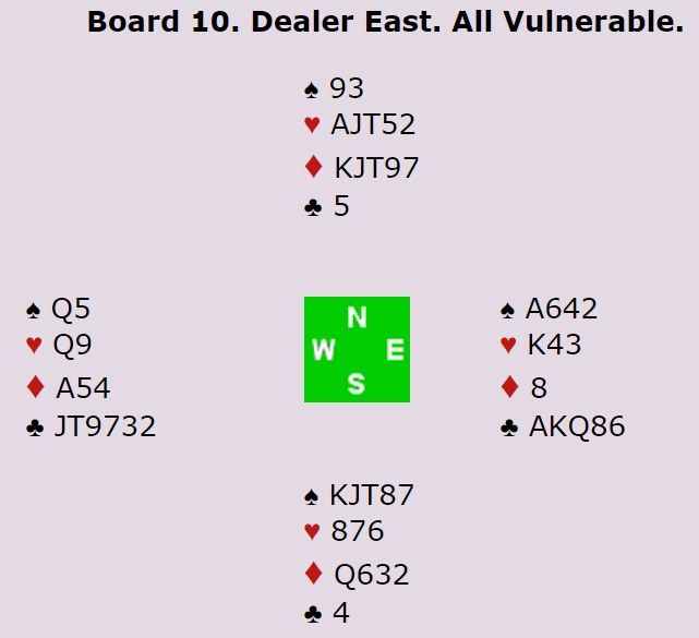 Det handlet om å komme seg i 5 kløver i stedet for 3NT. Hvis 3NT blir kontrakten må det komme spar ut fra syd for å vinne ni stikk. Da gir spar dame det åttende stikket, og det er bare å sette opp ett hjerterstikk. Med ruter eller hjerter ut (fra syd) blir det bet i 3NT.