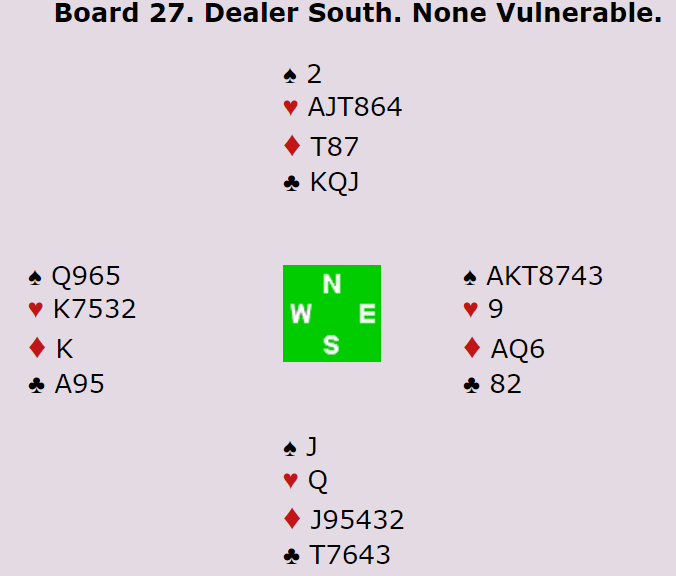 Styrken var mer enn god nok for løft, han valgte 5 kløver siden det er fare for mange «bortkastede» poeng i hjerter. Men 5 kløver vil lett gi dårligere score enn 3 NT så nå valgte jeg å avslutte med løft til 6 kløver. Det satt supert, med kl D i Øst lot seg fiske opp og to stjelinger i hjerter avslørte at Øst der hadde hj KD7 så fargen ble godspilt. Topp som eneste par i lilleslem.