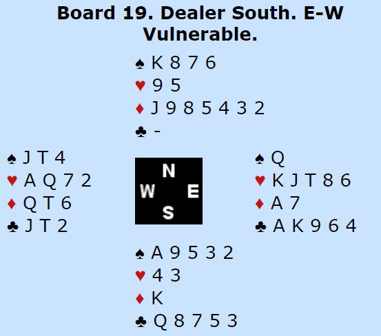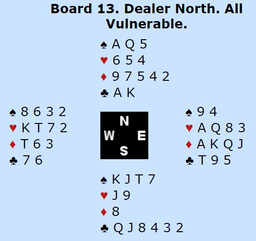 Marianne Harding (syd) åpnet med 2 spar, femkorts farge pluss en minorfarge og 3-10 poeng. Vest passet og Ann Karin Fuglestad klinket til med 4 spar direkte med nrods kort. Øst sa 4NT, to steder å spille. Vest valgte da å si 5 ruter som øst korrigerte til 5 hjerter og viste dermed ruter og hjerter. Nå løftet vest til 6 hjerter, en tvilsom avgjørelse etter min mening. En bør i slike situasjoner ta litt høyde for at makkeren har strukket seg for at de ikke skal bli utmeldt. Men poenget er at de ikke vet sikkert, N/S har tatt bort alle muligheter for å undersøke.