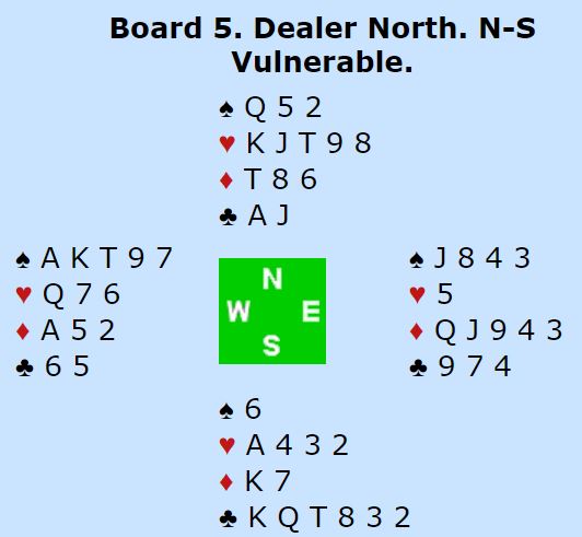 Ved fire bord havnet N/S i 5 hjerter, mest sannsynlig etter at Ø/V stampet. Tre av de N/S parene gikk bet i 5 hjerter. Foruten det norske N/S-paret gikk ett par til bet i 4 hjerter. Ved ett bord spilte Ø/V 5 spar meldt over N/S sin 5 hjerter. Det kostet 300, det er ni stikk i sparkontrakt om en løser ruteren uten taper.