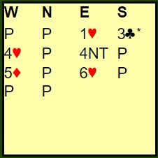 Merk at dette er en sånn spørresituasjon hvor 4NT som spørsmål er litt høyt. Over 5 ruter-svar på 4NT (og hjerter er trumf) blir det ikke plass til å spørre om trumf dame. Så her måtte Sunde gjette. Han valgte altså å si 6 hjerter! Det kan jo være at vest har femkorts trumf også, og da går det som regel bra selv om hun ikke har trumf dame. Men har hun fire små hjerter må det sitte 2-2, og er det kun trekorts trumf hos vest kan det være for hardt med slem.
