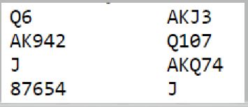 Lilleslem i hjerter er mye dårligere enn om ruter er trumf. Men også 6 hjerter går greit slik det sitter, selv om det kommer kløver ut. Det står tretten stikk i hjerterkontrakt uansett utspill siden hjerter konge sitter dobbel i saks!
