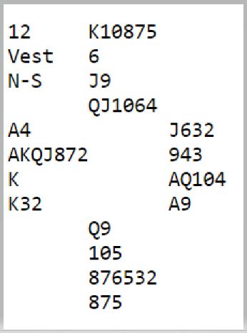 Vår (anti)helt på vests plass hadde imidlertid andre planer. Jeg tipper han var litt påvirket av den stilen som mange spillere spesielt i Australia har blitt tilhengere av, svært tynne åpningsmeldinger selv med balanserte hender. De mener den aggressiviteten lønner seg, men jeg er nokså tvilende til det. Det må da ofte bli litt vanskelig hvis man ikke vet om det er minst 12 poeng på den andre siden, eller i alle fall 11 gode poeng?