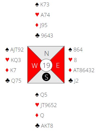 ruterkontrakt er det åtte eller ni stikk, alt etter om man tipper trumfen riktig med kongen og ruter til tieren, eller om man satser på å toppe fargen.  Det er et såkalt begrenset valg idet kongen spilles og en honnør kommer på bak A-10. Den teorien tilsier finesse andre gangen, men man kan jo aldri vite sikkert. Syd som åpnet kan godt ha startet med Q-J dobbel.