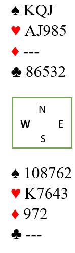 Men toppen gikk til et par som fikk tak i +1400 i motspill mot østs 3 hjerter doblet. Brage Hansen Moe - Håvard Moe fikk det beste resultatet på spillet for egen maskin, dvs. de fikk hjelp av en uheldig utspiller på vests plass. De spilte nemlig 6NT. Syd var spillefører, og vest spilte ut kløver. Den fikk seile til knekten. Ned med A-K i spar. Sitsen oppdages og finesse over tieren kan tas. Da er det 5+2+2+3 = 12. Men det oppstår i tillegg en fin tosidig skvisposisjon. Sparstikkene innkasseres og la oss si du tar A-K i kløver underveis for oversiktens skyld. Før den siste sparen ser det slik ut.: