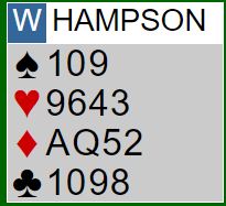 Vets dobbelton i spar er bra. Trumfen er ok. Hampson så vel litt på kløverkombinasjonen også, 10-9-8 kan være nyttig, kanskje mye bedre enn tre bitte små. Og det var sannelig korrekt. Hampson la på til 5 ruter!