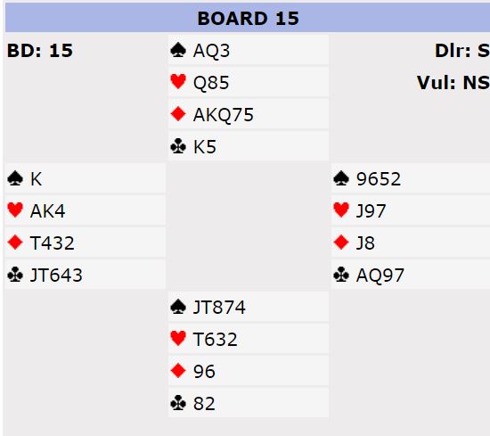 Etter de mest elastiske systemer der grandåpning som inneholder 15- 17 hp og 5-kort major er tillatt vil Vest i 1. hånd åpne med 1 NT og Øst lukte på slem med sine 15 hp.men siden 15+15 hp da er i minte laget SKAL jo Vest passe slem 4 NT fra Øst -invitten. Men her gikk det bra for se sleste, 4 sp og utgnag i grand gikk hjem siden det blie vanskelig uten kløver ut å hindre 12 stikk.