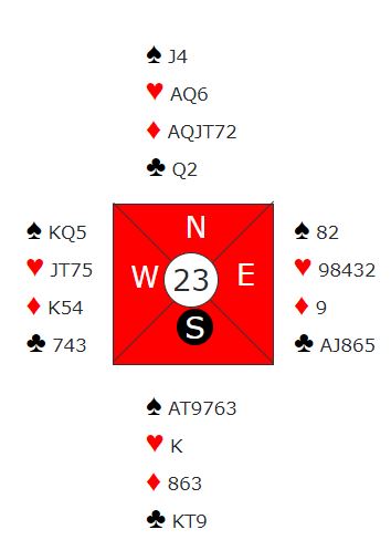 De som var i 4 spar og vant ti stikk fikk likevel litt over middels siden det var kun delkntrakt ved noen bord. Ett par fikk lurt til seg elleve stikk i 4 spar (Ø/V fikk ikke tatt for kløver ess) som ga nest topp. Kun ett par var i 3NT, og de fikk for sikkerhets skyld tolv stikk, alenetopp for +690, men det ville gitt topp med +660 også. Det var imidlertid høydepunktet for det paret, en enkelt topp hjalp dem ikke så mye da de endte under middels. Så det er vel kanskje slik at det i det lange løp lønner seg å følge lærebokas anbefalinger likevel...?