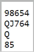 På spar 8 må vest holde hjerter konge, hvis ikke gir hjerter 8 det tolvte stikket. Følgelig blir det kun to kløvere hos vest i trekortspossen. Og øst må holde en ruter så han vil også kun ha to kløvere med tre kort igjen. Dette er en såkalt show-up squeeze, og spillefører vet med 100% sikkerhet at kløveren sitter 2-2 til slutt!