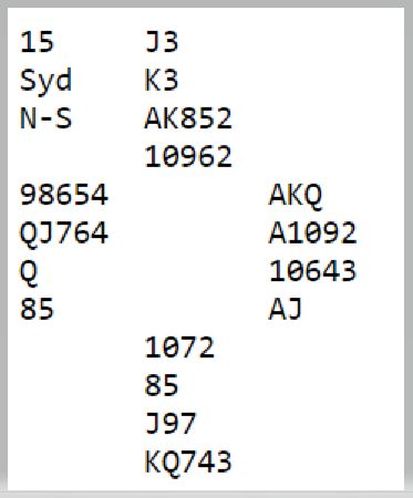 Kontrakten var 6 spar (S) ved begge bord. Det er vanskelig å se hvordan tolv stikk skal kunne vinnes. Trumffargen kan løses uten taper, men selv med fem sparstikk, hjerter ess, to ruterstikk og to i kløver blir det kun ti stikk, eller elleve med tre stikk i kløver. Det kan se ut som å trumfe ruter på bordet er tingen. Det blir imidlertid trøbbel, for det må jo gjøres før trumfen er tatt ut. Og på ruter ess i andre ruterrunde trumfer vest. Spillefører kan ha håp om å godspille ekstra hjereterstikk om fargen sitter 4-4, eller kongen tredje, men som du ser sitter kongen femte.