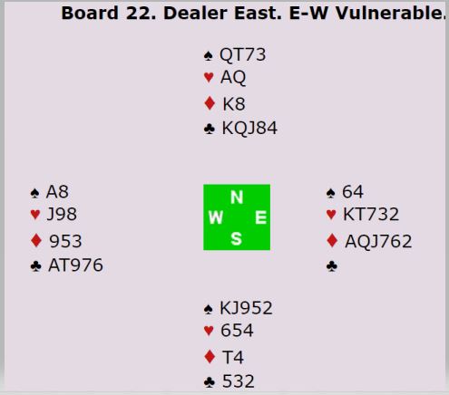 En rask gjennomgang av listene til SCORWAY viste at de spilte godt og solid. Så at vi tar med et særdeles heldig spill er ikke for å påstå de hadde flaks i turneringen over hele 144 spill. Men i dette tilfellet Fru Fortuna i perlehumør og på SCORWAY sin side. Spillet starter med et valg av åpningsmelding for øst, og du kan jo selv bestemme deg for hva du sier: