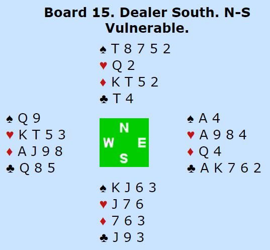 Selv om øst ble spillefører sånn at sparutspill ikke var truende for spillefører (syd har kongen) gikk det ikke an å vinne slem. Det ble en hjerter- og en rutertaper. Fem av 14 Ø/V-par gikk bet i slem, resten spilte komfortable utgangskontrakter.