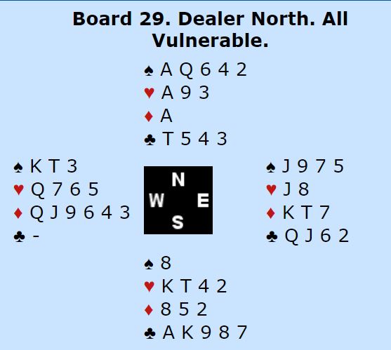 Ved det andre bordet åpnet nord med 4 spar som en normal person. Syd var ikke med til 5 spar. Mine lagkamerater som var klart bedre enn oss i grunnspillet var skuffet over sin avgjørelse i dette spillet siden de frivillig meldte seg opp i 6 kløver som gikk en bet, +100. Men denne gangen ga det 14 IMP inn med resultatet fra vårt bord som vi leverte sammen med en «crazy» historie.