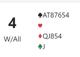 Forklaring: vi bruker overføringssvar på 1 kløver, og det var borte for meg et øyeblikk. Jeg hadde altså ikke vist firekorts hjerter, men firekorts spar og renons i hjerter!
