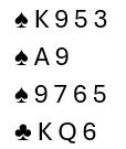 Vest passer, og Ø/V passer resten av meldingsforløpet. Makker (nord) åpner med 1 ruter og du svarer 1 spar. Det kommer 2 spar fra makker og det er din tur. Det er selvsagt utgang her, men det kan stå slem også. Hva melder du?