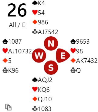Så meldingene starter nok med 1 kløver og 1 spar innpå fra øst. Da sier syd 2 hjerter, naturlig rundekrav. Nord støtter hjerteren. Nå vet ikke N/S hvor gunstig det står til i ruter. De vil normalt stoppe i utgang selv om det gjøres et optimistisk slemforsøk, for da finner de ut at de manger både ett nøkkelkort og trumdamen. Det er dessuten mulig at vest med bra spartilpasning vil være med i meldingene også.