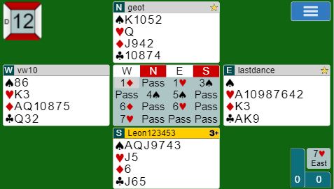 Da blindemann (vest kort) kom ned på bordet syntes jeg først vest hadde vært ganske tøff som sa 7 hjerter. Men i ettertid går det vel an å være enig i at det er godt vurdert? Makker er helt sikkert renons i spar, og han storeslemsinviterer med egen hjerterfarge uten ruter ess og uten trumfkongen! Må ikke det være nok til at 7 hjerter skal kunne stå hvis makker vet hva han driver med?