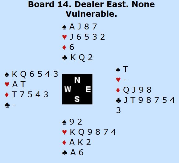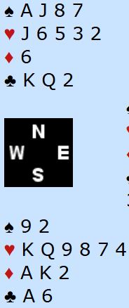 Makker hadde jo noen verdier til deg selv uten honnørpoeng med en singelton og to trumf. Men hvis du spiller rett etter nesen og denger ned hjerter ess går det galt hvis det sitter slik fra start, en ganske sannsynlig sits slik meldingene har gått: