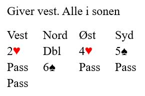 Det var et hjertervalg fra start, og en stund så det ut som syd neppe kunne ha hjerterlengde. Siden du «giddet» å sjekke om det kom noen god informasjon fikk du vite at nå er det ikke noe valg i hjerter likevel. Du spiller hjerter konge, hjerter til esset og hjerter til tiren uten å bekymre deg i det hele tatt hva nord legger, for en hjerter til (knekten) har han ikke!