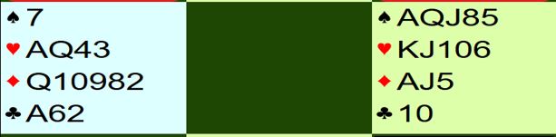 N/S har 17 + 12 poeng, dvs. 29 HP til sammen. Vanligvis bør man har ca. 32-33 HP til sammen for å ha en bra sjanse til å vinne lilleslem. Men det er bare en rettesnor som dog stemmer bra i de fleste spill, spesielt hvis de to hendene er relativt balanserte.