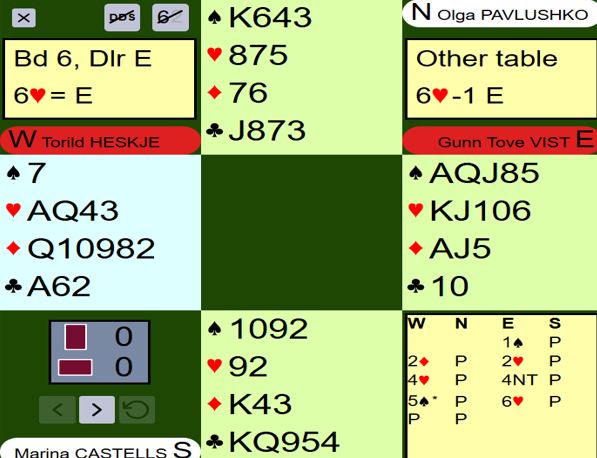 I omtalen av ett av spillene hvor det kunne bli tolv-tretten stikk skrev jeg noe sånt som «...egentlig ikke en slem som bør meldes, for så mange stikk blir det bare fordi motpartens kort sitter veldig fordelaktig for spillefører». I ettertid må det innrømmes at det egentlig er en slem som er bra å melde hvis en ser på hvor stor sjanse det er for å vinne nok stikk. Men det er ikke så lett å vite når man melder og ser kun sine egne kort, og i forhold til antall HP til sammen er det normalt for lite til å melde slem med stor sannsynlighet for å vinne den.