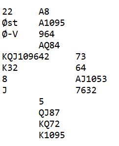 Hva med denne hånden i andre hånd etter pass fra giveren øst, med Ø/V i sonen og N/S utenfor?
